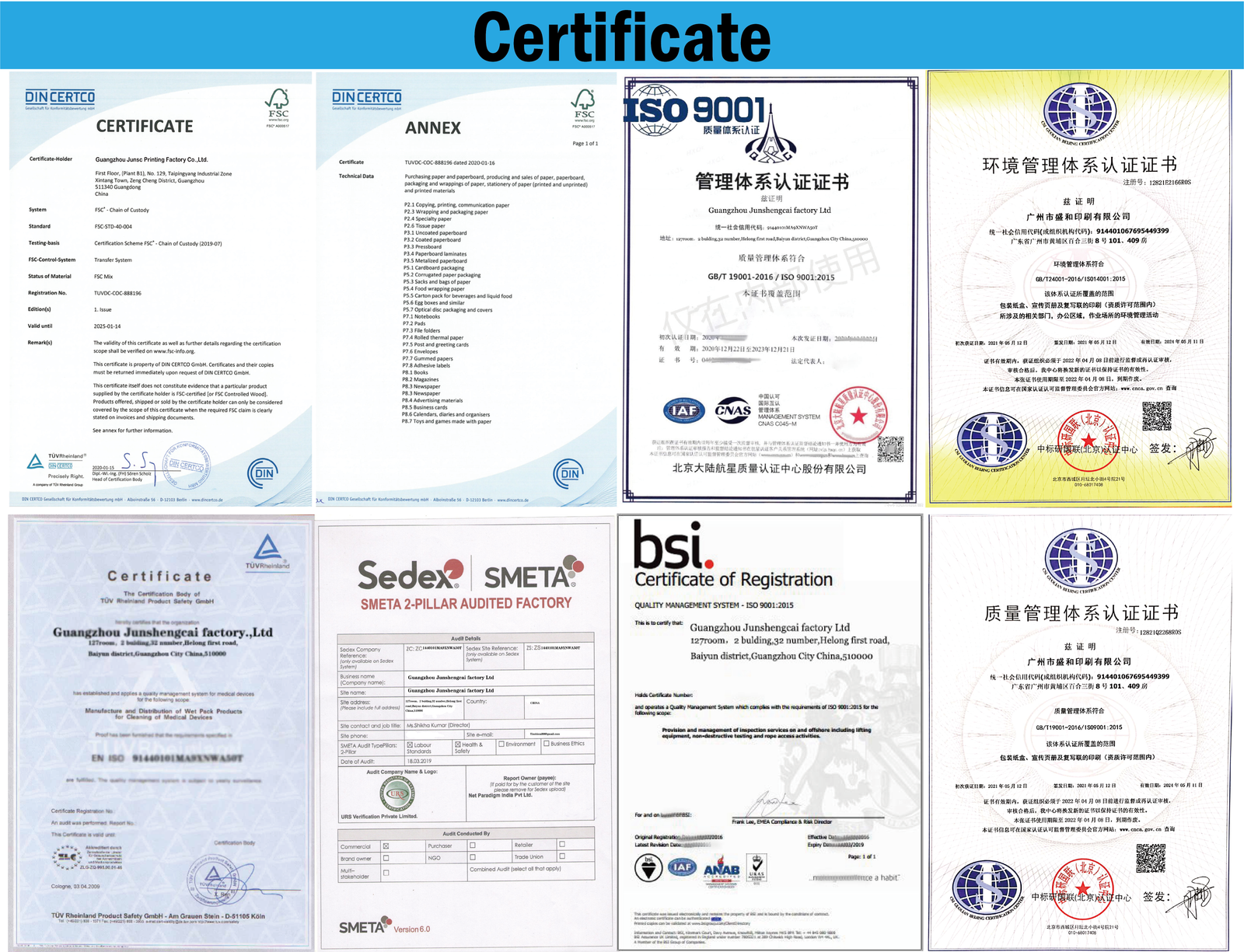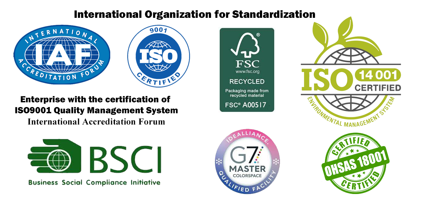 With the fierce market environment, in view of the growing scale, in order to adapt to the changes of the international environment.our factory has successfully imported ISO 9001:2008/QMS quality management system certification, “ISO 14001:2004/EMS” environmental management system certification, “OHSAS 18001:2007” occupational health management system certification, “FSC-COC” forest management system certification “G7” color technology control certification, “BSCI” commercial social responsibility standards recognition.